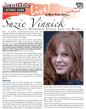 Her most recent album, Live at Bluesville (2012), came about when a radio interview turned into a recording session. Bill Wax, the producer of Sirius/XM B.B. King’s Bluesville station, basically said “Here’s our studio, go in and have some fun!” The result was a typical Suzie tour de force of vocal and guitar. In the CD review section of our December issue I wrote: “She leads off this album with ‘You’ll Be Mine’… Her voice curls around a lyric like a snake on a pole and she walks the bass and treble strings with a commanding strut.”