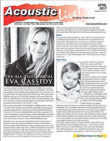 Although a lot of material has been posted online, the bulk of the observations that follow are taken from the book Songbird: Eva Cassidy: Her Story by Those Who Knew Her by Rob Burley and Jonathan Maitland.