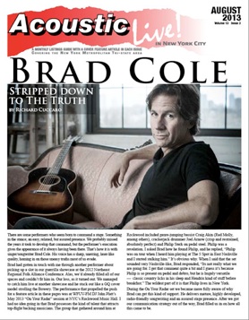 The performance that propelled the push for a feature article in these pages was at WFUV-FM DJ John Platt’s May 2013 “On Your Radar” session at NYC’s Rockwood Music Hall. I had no idea going in that Brad possesses the kind of talent that attracts top-flight backing musicians. The group that gathered around him at Rockwood included genre-jumping bassist Craig Akin (Red Molly, among others), crackerjack drummer Joel Arnow (crisp and restrained, absolutely perfect) and Philip Sterk on pedal steel. Philip was a revelation. I asked Brad how he found Philip, and he replied, “Philip was on tour when I heard him playing at The 5 Spot in East Nashville and I started stalking him.” It’s obvious why. When I said that the set sounded very Nashville-like, Brad responded, “It’s not really what we are going for. I get that comment quite a bit and I guess it’s because Philip is so present on pedal and dobro, but he is hugely versatile — classic country licks in his sleep and Hendrix kind of stuff before breakfast.” The wildest part of it is that Philip lives in New York.