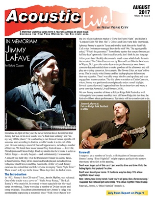 A few years later I luckily discovered a small venue which had a formula that worked. The Cabin Concerts run by Tim and Lori Blixt in their home in Wayne, N.J., gave the entire door to the performers (as most house concerts do) and enabled them to make good use of the afternoon and still play an evening concert at, for example, The Towne Crier, an hour’s drive away. That’s exactly what Jimmy and his backup players did on more than one occasion. Thus I was able to see him live and up close and even engage him in conversation. The title photo was taken at Cabin Concerts, where Jimmy was positioned serendipitously under a small skylight. Several years afterward, I approached him for an interview and wrote a cover story for Acoustic Live (February 2008).
