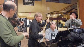 Around the piano, Bob, at far right, does what he loves best — playing blues harp at one of the many jams. No skepticism here.