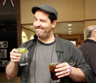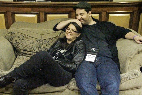 Above, musician Mark Allen Berube breaks out a sly grin at the welcoming cocktail party, and below, snuggles with his wife, musician Carolann Solebello