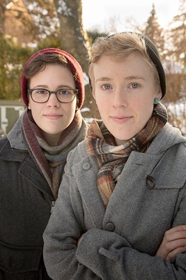 An ethereal blend of two voices, guided by fate to find each other, travels the wire from iTunes to earbuds and into my ear canal — so exquisite, it’s almost unbearable. Hannah Hickok and Maggie Kraus, a lesbian folk-pop duo, look at all the facets of living — loving, losing, friendship — as if peering through a microscope, taking the facets apart and reassembling them with delicate, faerie fingers. The songs are presented like gossamer gifts. A case in point is the stark beauty of “Curfew” from their second album, Muscle & Bone. Hannah wrote the song and sings the lead vocal with a call-and-response from Maggie in a passage near the end. It might simply be an unrequited love song, but it could easily describe a heartbreaking failed connection between two people, one who is gay and one who is straight or who is latently gay but not ready to accept a same-sex relationship. Intentional or not, it covers a rocky terrain young homosexuals tread daily. The poetic dissection of raw emotion is astonishing. The words float, first over a sighing harmonium-like shruti box, then a delicate guitar refrain and a keening cello: