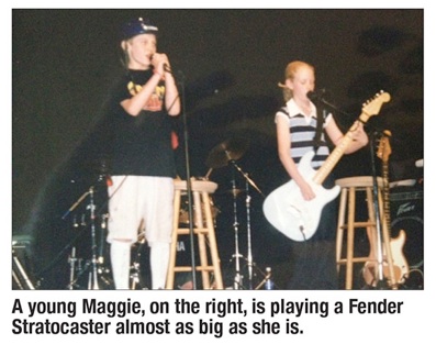 Maggie was in chorus, but switched her energies to forming rock bands when she was still in middle school. She’d coax boys into being members of her bands, selecting roles for them (“OK, Brian, you’re gonna play drums…”), regardless of their lack of experience. In high school, tired of wrangling other students into supporting her, she returned to acoustic guitar and performed with two friends as an acoustic trio.