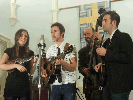 ethereal and sublime. Demetrius Becrelis (the serious one), his brother Alex, and Monica Rizzio, backed by Laird Boles, were weaving their singular magic. The nearest comparison to anything heard before would be Nickel Creek or Chris Thile’s solo work. A heady mix of bluegrass, old-timey and pop music poured from Dimitrius on guitar and ukulele, Alex on mandolin, Monica on violin and ukulele and Laird on upright bass. Demetrius, Alex and Monica switched lead and harmony vocals and Laird provided backup.