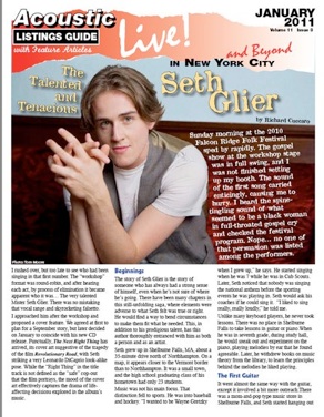 During his final months at Berklee, he audited a course with Livingston Taylor. This gave him greater insight into performance skills and holding the attention of an audience. Livingston perceived Seth’s innate ability and supported his decision to leave Berklee early and just start performing. He and Livingston have become good friends and Seth opens numerous shows for him throughout the year. Although Seth spent just one year there, he has since been interviewed by berkleegroove.com, “The Student Voice of Berklee College of Music,” as one its success stories and has been selected by Livingston to perform as part of a “Fresh Voices from Berklee College of Music” series (City Winery, NYC, Jan. 27th).