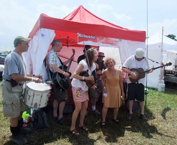 I followed them part way, staying inside, next to Jim, the harp player, and Sarah, the fiddler, soaking in their swooping melody lines that helped the song fly. Tom, the guitarist, and John, the bassist, remained behind me, helping to drive the song on its merry way. As the last strains of the blues harp finished the song, Mark swung back into the canopy to change his instrument for the next song. The audience joyfully whooped its approval. We’ve uploaded a video of the song to YouTube, that shows the band playing for Alternate Root TV. It includes eighth member, Rik Mercaldi, on lap steel. Rik was not at Falcon Ridge in 2010.