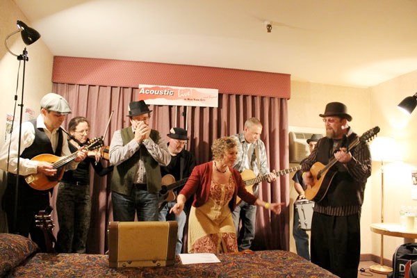 Sarah Banks, the violinist, came along next. She lives on the other side of “their little enclave” in Park Hill. For a while it was just the four of them, on the porch, playing traditional songs and Mark’s originals. Sarah pressed Mark to do gigs, saying, “These songs are really good and we sound really good and we should get some gigs.”