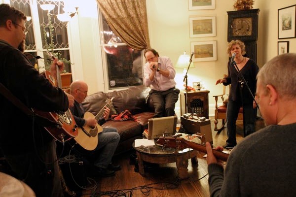Five members of the band who were present the night of our interview, at practice in Mark and Beth’s living room,