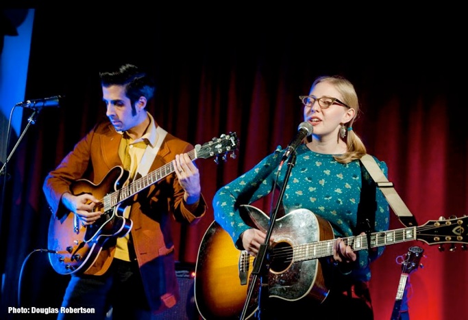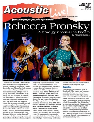 Likewise, she’ll take her guitar and put it in a strange tuning to move herself outside of her comfort zone. She actually enjoys not knowing where she’s going. A key factor in her partnership with Rich is that he will follow her and work out on guitar (or piano) what will work with her composition. Rich uses the guitar in total service to Rebecca’s songs. There are no gratuitous solos or noodlings. He’ll simply (well, not so simply) find a sound to illustrate the theme of her song. An example of Rich’s skill in accommodation occurred at the 2013 Northeast Regional Folk Alliance Conference. Considering portability, Rebecca brought her tenor guitar for its small size and Rich brought an acoustic guitar, leaving his electric at home. In their late-night Acoustic Live guerrilla set, Rich fingerpicked melody patterns in harmony with the songs Rebecca sang. As they left the room after their set, I overheard WFUV DJ John Platt compliment Rich on his choice of accompaniment.
