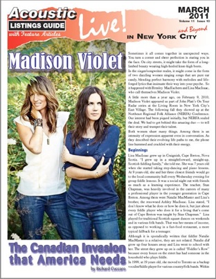 A little more than a year ago, on February 9, 2010, Madison Violet appeared as part of John Platt’s On Your Radar series at the Living Room in New York City’s East Village. The following fall they showed up at the Northeast Regional Folk Alliance (NERFA) Conference. Our interest had been piqued initially, but NERFA sealed the deal. We had to get behind this amazing duo — to tell their story and trumpet their talent.