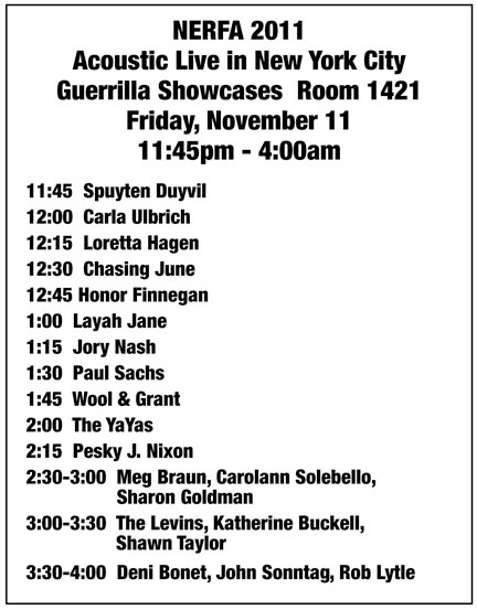 Honor will be a featured performer in our Acoustic Live guerilla showcase room at the 2011 Northeast Regional Folk Alliance Conference (Our line-up is below). We’re proud to have the chance to present someone who combines humor with powerhouse vocals. Watch our listings pages for future performances from her.