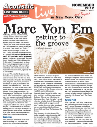 In the late ’90s, out of all the players who showed up to the open mic at the Fast Folk Cafe, he was one of the very few who stood out and lasted. He always had that something extra, that power in the vocals, a sharpness in technique on guitar, an assuredness that rendered him memorable. No… make that unforgettable. The sound of Marc’s voice will remind people of Dave Matthews, maybe Jack Johnson. He gets those comparisons a lot. Sometimes even Van Morrison. His stuff is not exactly folky, but it’s definitely wooden music and it sure generates excitement. I had already bolded his name in my listings for many years. Then WFUV’s John Platt picked him for one of his monthly On Your Radar acts at the Living Room in New York City in August of this year. I hadn’t seen him in the flesh since the long-gone Fast Folk days, but we quickly got reacquainted before his set. The intensity of his guitar and vocal attack sold me and I offered him a cover feature on the spot.